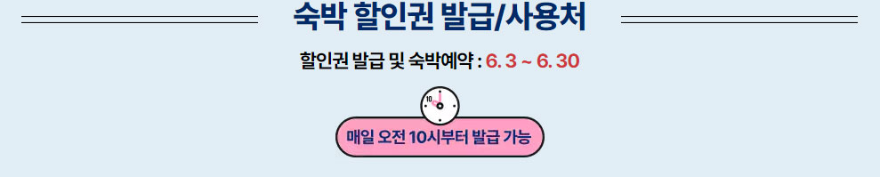 쿠폰 발급 기간은 6월 3일 ~ 6월 30일이며, 입실 시간은 : 6월 3일 ~ 7월 14일까지이며, 사용지역은 비수도권(서울, 경기, 인천 제외)에서 모두 사용이 가능합니다.