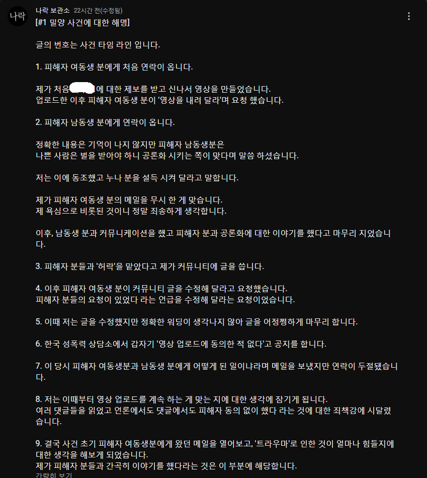 유튜버 '나락 보관소'는 최근 밀양 성폭행 사건의 가해자 신상정보를 공개한 후 삭제했다가, 다시 게시물을 올리고 해명하는 과정을 거쳤습니다. 나락 보관소는 유튜브 커뮤니티에 "밀양 사건에 대한 해명"이라는 글을 통해 신상공개 경위와 관련된 논란을 해명했습니다.