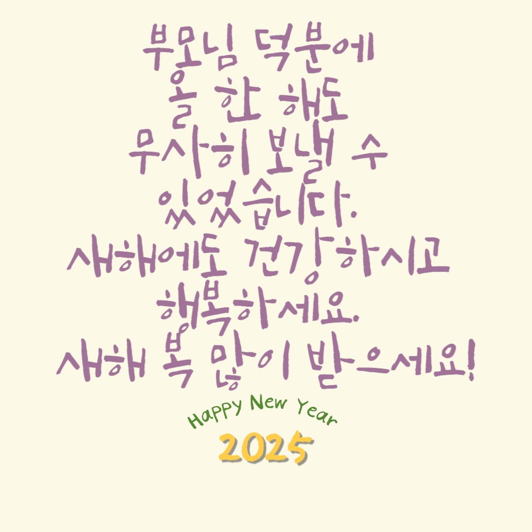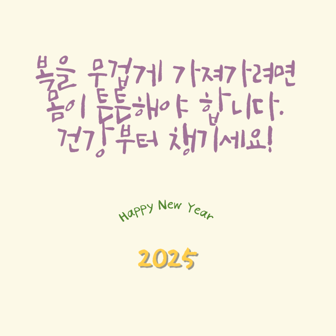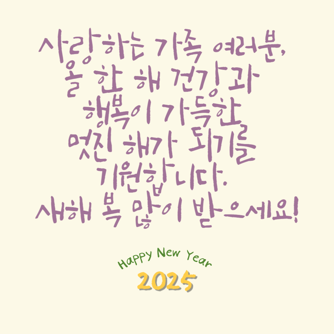 - 새로운 목표와 도전에 함께 나아가는 2025년이 되기를 소망합니다. 늘 건강과 행복이 함께하시길 바랍니다.